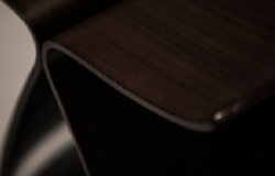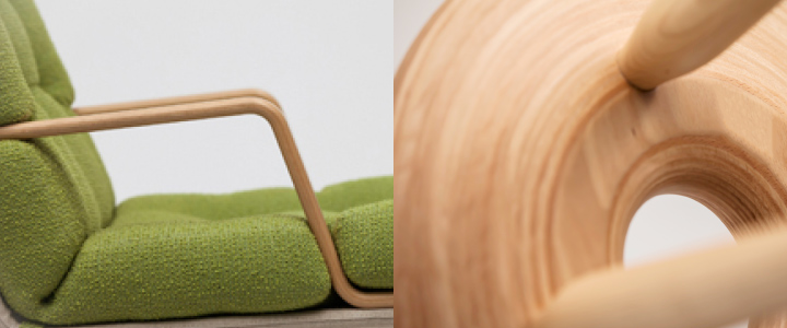 Tendo Mokko makes its furniture using thin layers of wood that are layered together and formed by putting them into a press and adding pressure and heat, and we have developed a new type of compaction technology that requires less heat and shorter time in the press so that the wood can be formed into just the right thickness. This new technique leaves a clean wood grain that looks good and is easy to process.
